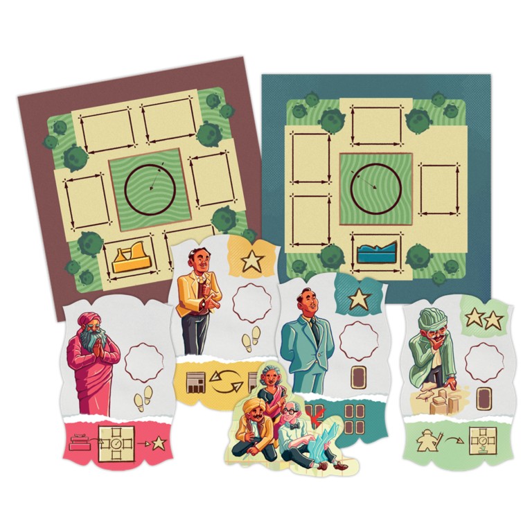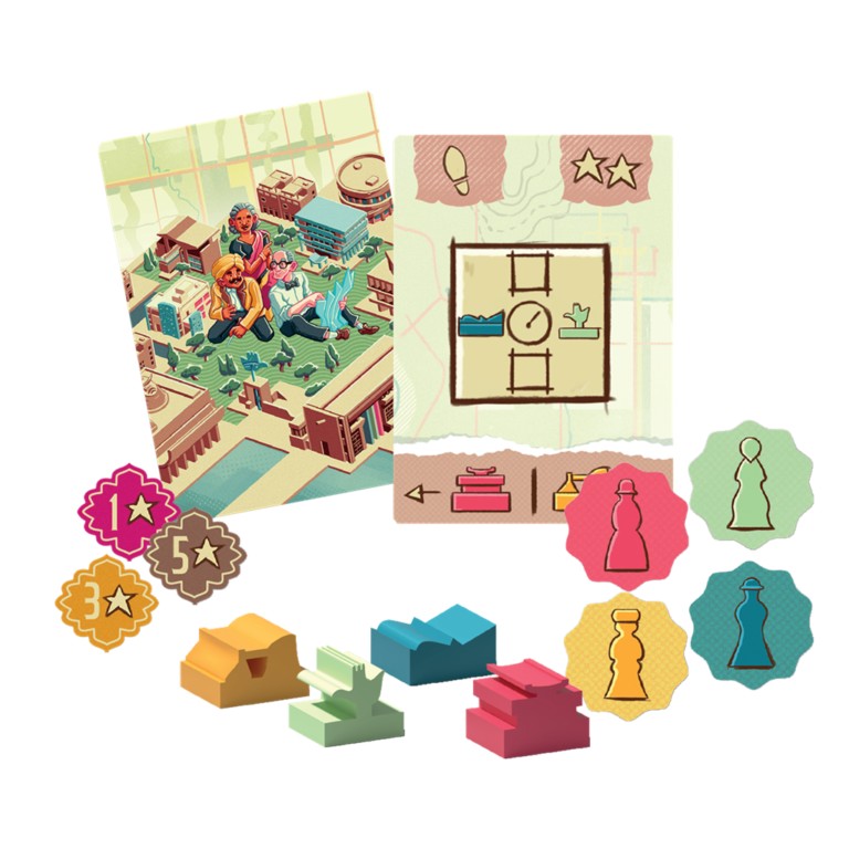 12 losetas de especialista a doble cara, 16 losetas de sector a doble cara, 36 cartas de proyecto, 72 edificios, 4 arquitectos, 4 peones de especialista, 20 supervisores, 16 fichas de especialistas, 78 puntos de prestigio, 10 losetas de calle, 1 ficha de jugador inicial