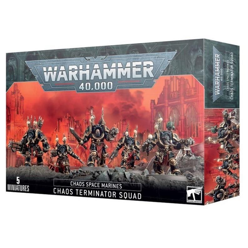 Los Chaos Terminators son veteranos fuertemente acorazados ataviados con armaduras tácticas Dreadnought corruptas. Forman la élite de las bandas de sus señores, pues aunque son pesados en comparación a sus camaradas en servoarmadura, nada inferior a un láser antitanque dedicado puede detener a un Terminator a la carrera. De sus enormes hombros cuelgan trofeos con púas, los cráneos del enemigo, como un testamento bárbaro de la destreza marcial de su portador. Los cascos han crecido hasta convertirse en máscaras bestiales de las que brotan colmillos enormes y cuernos aserrados, muchos de los cuales están fusionados directamente a los cráneos de sus portadores.
