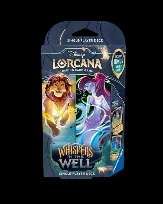 Adéntrate en el misterioso mundo de Lorcana con el Mazo de Inicio Susurros en el Pozo, protagonizado por Simba y Megara. Mientras los susurros resuenan en la tinta, los secretos comienzan a aflorar solo los Iluminadores más observadores y juguetones descubrirán la verdad.