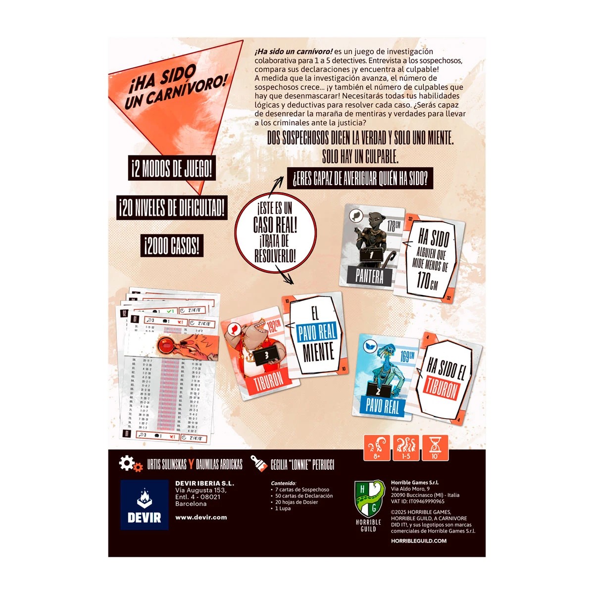 ¡Lo hizo un carnívoro! incluye dos mil casos, cada uno con una única solución, y la dificultad va aumentando hasta llegar a tener hasta siete sospechosos, declaraciones condicionales y distintos niveles de veracidad.