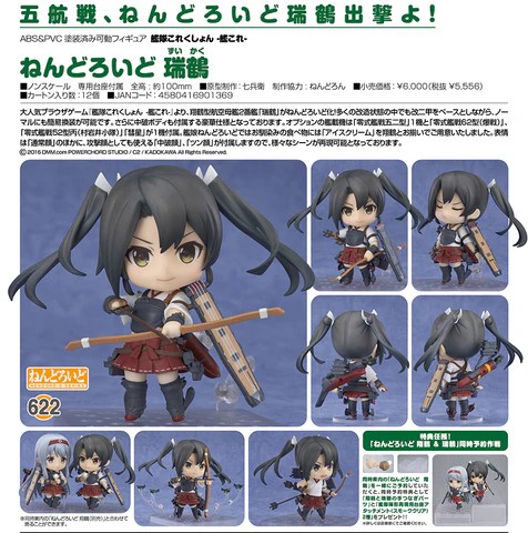Good Smile Company presenta la figura Nendoroid del segundo portaviones clase Zuikaku tal y como aparece en el videojuego «Kantai Collection -KanColle-«. Esta figura mide unos 10 cm y está hecha en PVC. Incluye 3x expresiones faciales, 1x cuerpo alternativo para recrear su apariencia medio dañada y un caza tipo Zero Model 62, un bombardero model 62, un bombardero Model 52C y un bombardero Suisei. 1También viene con un stand de exposición.