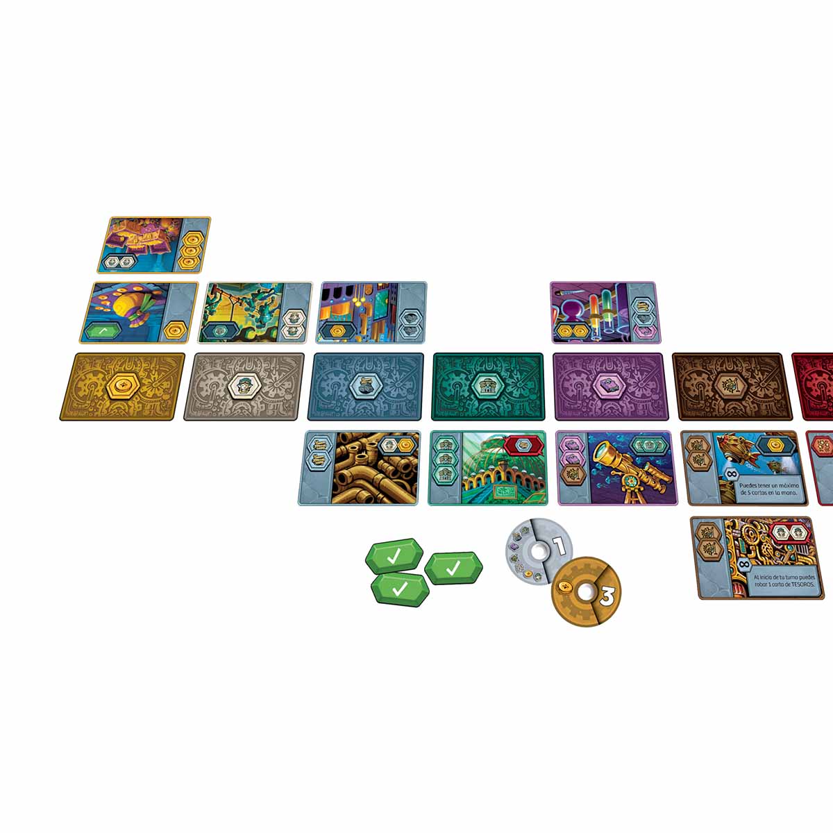 Con muy pocas reglas y un manual lleno de ejemplos, aprenderéis muy rápido a jugar. En su turno, los jugadores roban, juegan y activan cartas. Poco a poco irán construyendo varias columnas de cartas según su categoría, formando distritos. Según el tipo de carta, podrán activar distintos efectos, tales como aumentar el límite de cartas en la mano, robar cartas u obtener símbolos, entre otros. Cuando un jugador tiene activo un cierto número de símbolos puede reclamar el ídolo de ese distrito. ¡Pero cuidado! El rival puede robar el ídolo si supera el número de ese mismo tipo de símbolos en su distrito. Si un jugador logra activar 7 o más símbolos asegurará el ídolo de ese distrito.