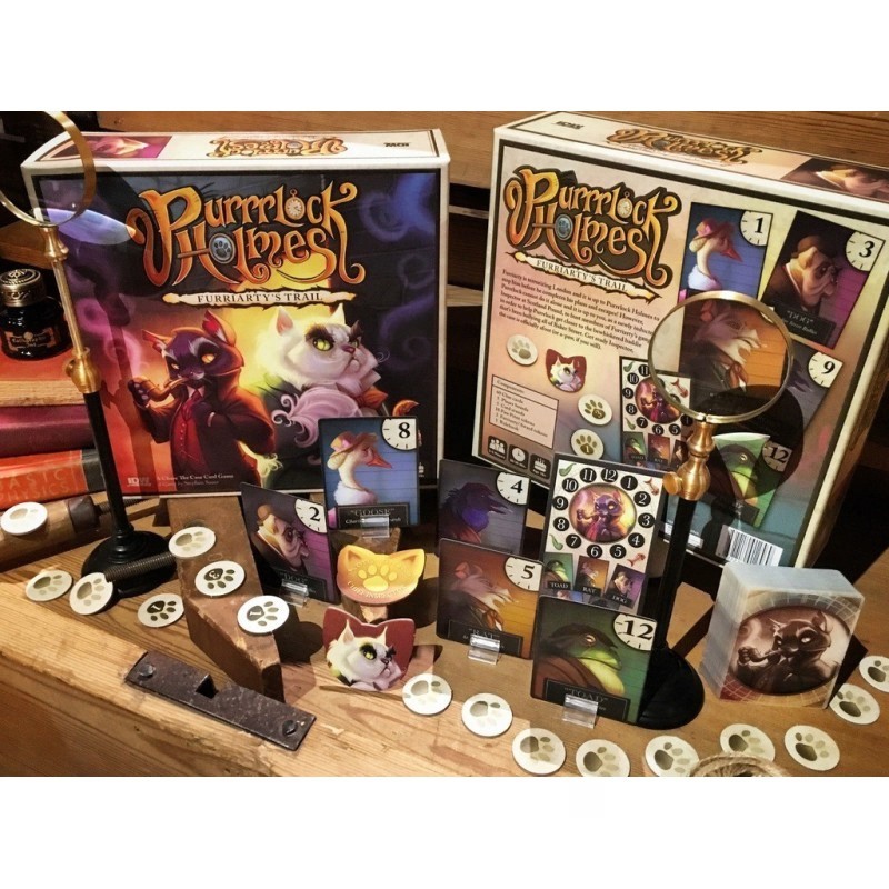 En Purrrlock Holmes: Tras la pista de Miauriarty, cada jugador roba una carta sospechoso oculta y se turnan para hacer conjeturas utilizando un mecanismo «reloj» sobre la identidad de su sospechoso desconocido. Los otros jugadores (que pueden ver a los sospechosos de otros jugadores) le dirán si va por buen camino en la investigación de su sospechoso. Averiguar lo suficiente lleva a deducir la identidad del sospechoso y podremos enganchar una pista que conduzca a Miauriarty. Cada pista está marcada con un número variable de puntos de victoria. Cada ronda, Miauriarty rellena su camino y estará más cerca de escapar, poniendo tensión entre los jugadores que acelerarán sus investigaciones para resolver el caso. Si pueden deducir suficientes sospechosos y reunir suficientes fichas, es posible que puedan superar a Miauriarty antes de que escape.