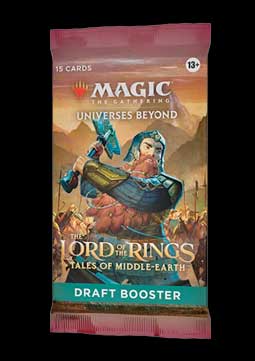 Draft Booster (1 sobre) The Lord of the Rings Tales of Middle-earth del juego de cartas Magic the Gathering. Español. Contenido: Cada sobre conteine 15 cartas y 1 token o carta de ayuda 1 carta rara o mítica 3 infrecuentes 10 comunes 1 tierra Hay una carta mítica foil tradicional sin borde en menos del 1 % de los sobres. También una carta foil tradicional de cualquier rareza que sustituye a una carta común en el 33 % de los sobres.
