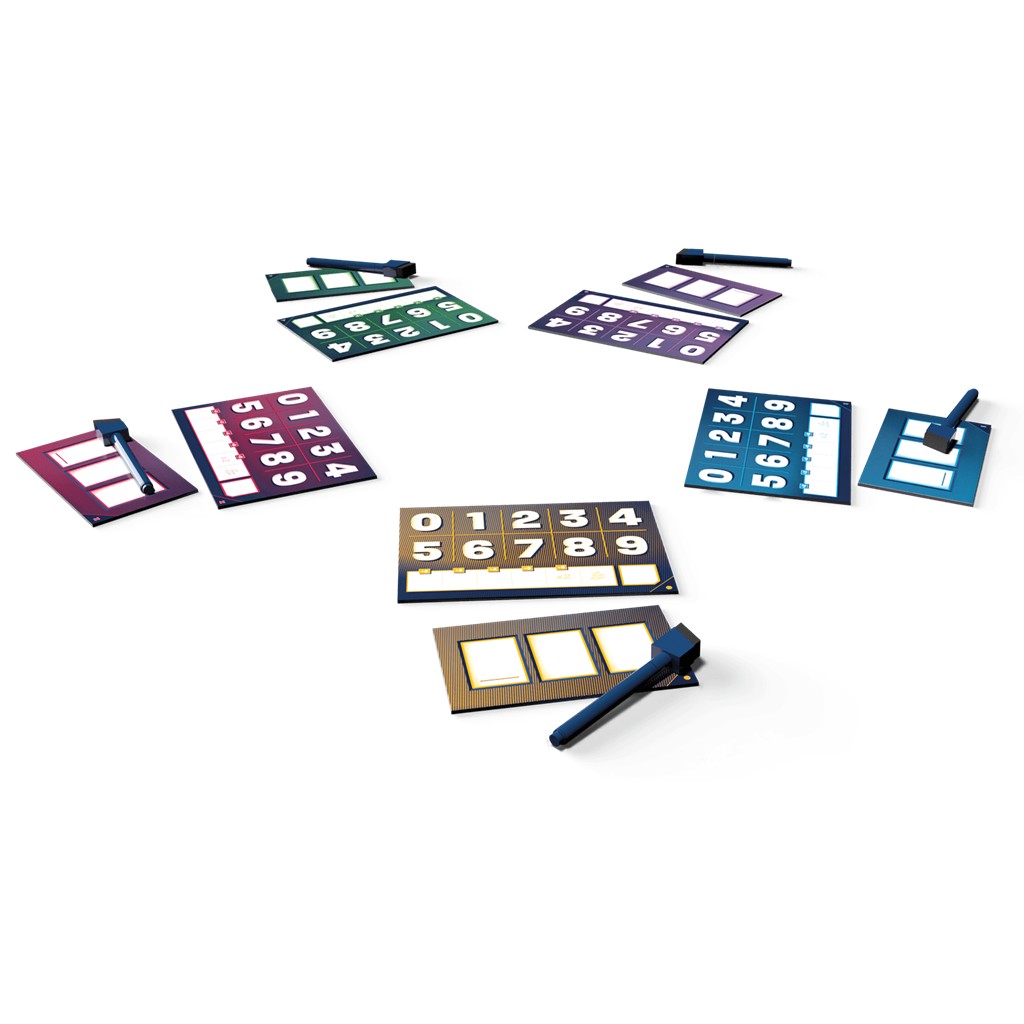 5 marcadores de puntos, 5 tarjetas de número, 5 rotuladores no permanentes.