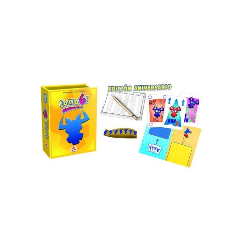 En esta edición aniversario, encontraréis el amado juego base, así como cuatro cartas especiales de los fans, para añadir más diversión y tensión, si cabe, al juego. Además, ¡no te pierdas las 4 cartas especiales inventadas por los fans de ¡Toma 6!, que añaden más tensión al juego!