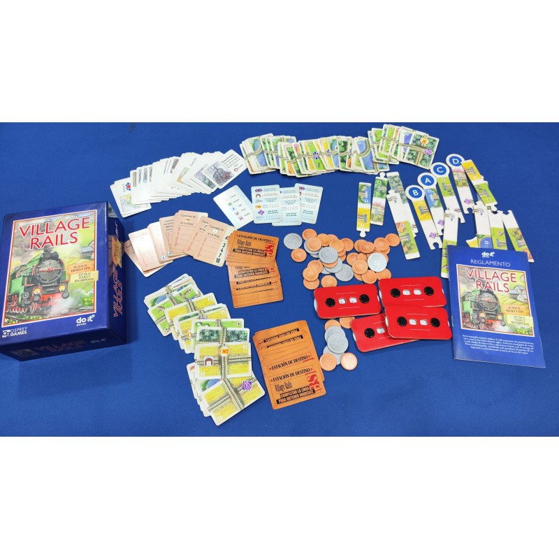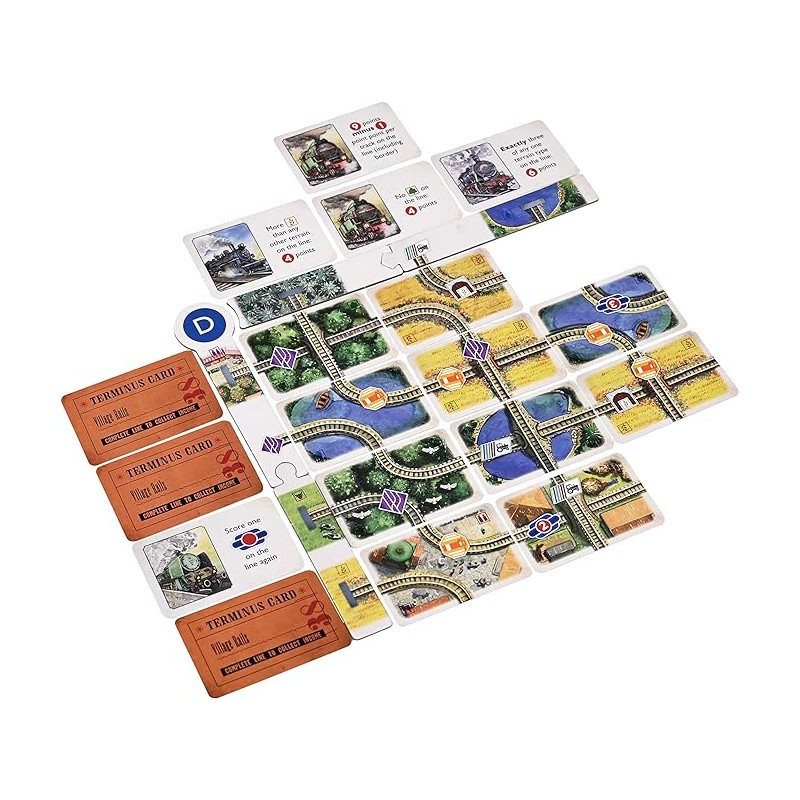 Juego de cartas de construcción de áreas, donde el ganador es el que consiga la mayor cantidad de puntos completando las 7 líneas del ferrocarril en una rejilla de 3 x 4.