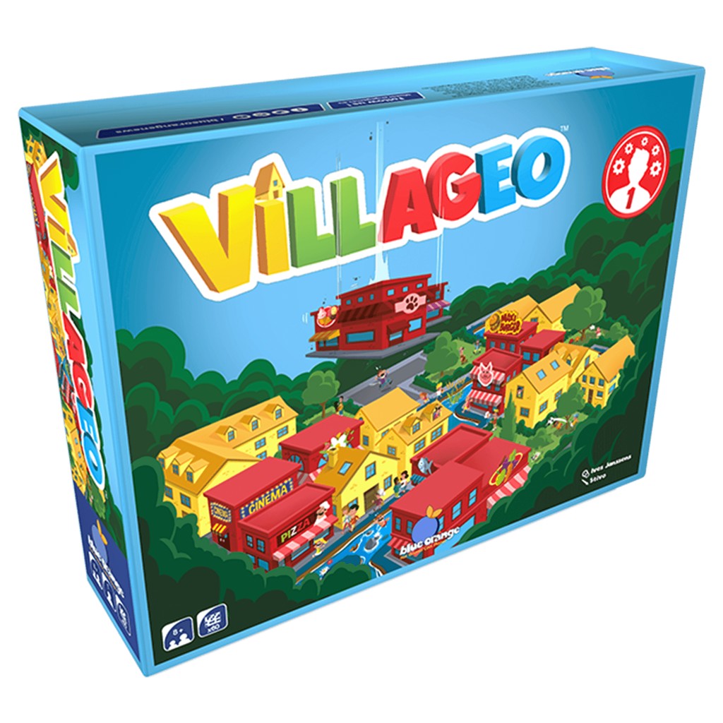 Conviértete en un renombrado urbanista creando las ciudades más bellas posibles. Coloca los comercios, casas, lagos y jardines en los terrenos más adecuados respetando siempre las restricciones del plan urbanístico para construir tu ciudad ideal. ¿Conseguirás finalizar los 60 proyectos de Villageo? CONTENIDO Cuatro tipos de losetas diferentes en forma de L: 4 Parques (verdes), 4 Lagos (azules, 4 Comercios (rojos), 4 Zonas residenciales (amarillas), 60 cartas de Mapa de Ciudad, 1 Marco de puzzle.