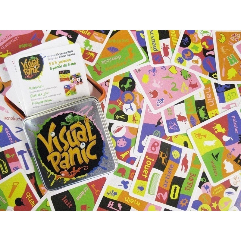 Visual Panic es un party game de reconocimiento de figuras. El objetivo del juego es conseguir el mayor número de cartas, descubriendo y nombrando las figuras de un determinado color que haya en cada tarjeta. Habrá que prestar especial atención a los camaleones, pues podremos llevarnos la carta directamente sin necesidad de reconocer todas las figuras.
